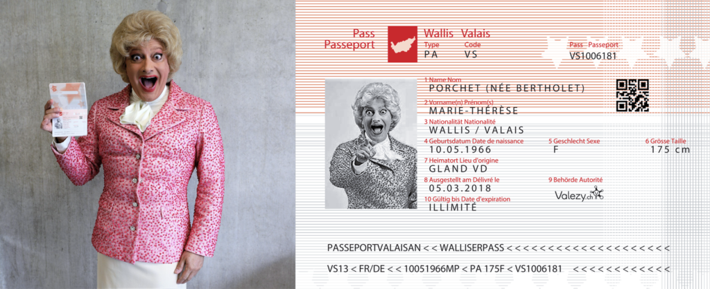 Marie-Thérèse Porchet, née Berholet, est une femme de la cinquantaine habitant à Gland, village dans lequel une place a été renommée à son nom « Square Marie-Thérèse Porchet ». Très occupée à discutailler au téléphone avec son amie Jaqueline Zbinden ou à critiquer sa concierge Lourdès, Marie-Thérèse a tout de même trouvé le temps pour devenir marraine du Passeport valaisan !