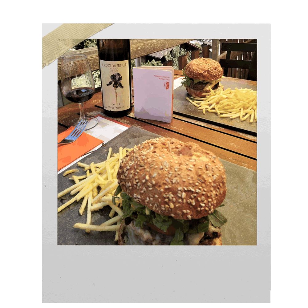 Arrivés en réservation de dernière minute, nous avons patienté à l’apéro avec le patron. Autant sympa que passionné de journaux de presse et de bières, il a pu nous trouver une table en terrasse malgré le monde. Avec mon épouse, nous avons passé un agréable moment ensoleillé avec une vue magnifique sur Les Collons, en profitant de notre offre du Passeport valaisan : un burger offert pour un acheté.